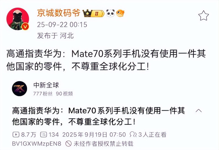 滑天下之大稽。高通居然指责华为说“Mate70系列没有使用一件其他国家的零件,不尊重全球化分工”。